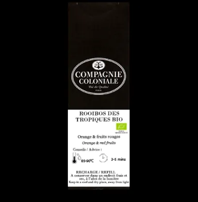 Rooibos aromatisé à l’orange, à la fraise et à la framboise, parsemé de morceaux de noix de coco, de framboises et d’écorces d’orange.