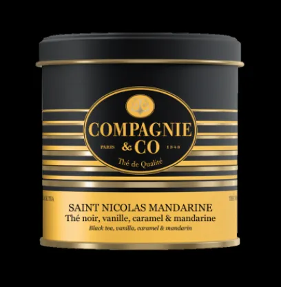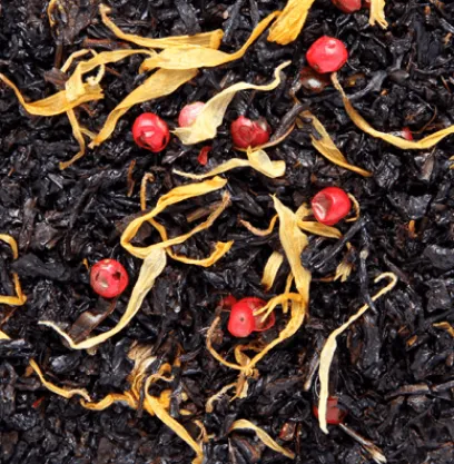 Mélange de thés noirs sélectionnés aromatisé caramel, vanille, et mandarine, décoré de fleurs et de baies rouges.