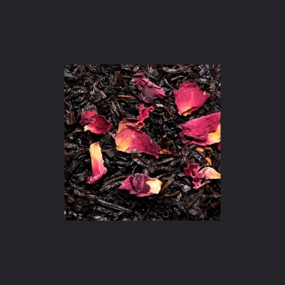 Mélange d’une sélection de thés noirs aromatisé à l’orange, aux amandes, et à la pêche avec des pétales de rose.