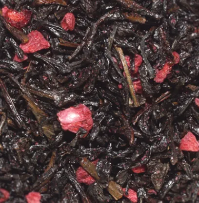 Mélange de thés noirs de Chine aromatisé cerise avec morceaux de fruits.