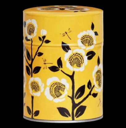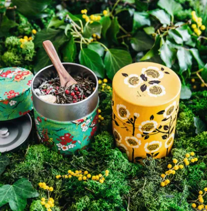 Boite de conservation de thé en fer blanc décorée artisanalement en France.