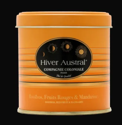 Hiver Austral® est un Rooïbos originaire d’Afrique Australe aromatisé aux fruits rouges avec une note de mandarine. Ce mélange peut aussi s’apprécier en infusion du soir, sans modération. Boite métal luxe 30g.