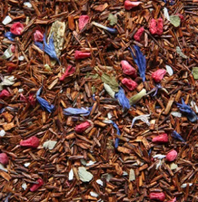 Rooibos aromatisé à l’orange, à la fraise et à la framboise, parsemé de morceaux de noix de coco, de framboises et d’écorces d’orange.