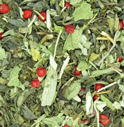Le thé à la sauge Jardin Royal est un mélange de thé vert Chun Mee, avec des agrumes, des feuilles de sauge (et non pas sous forme d’huiles essentielles) avec une légère note de banane qui adoucit les agrumes. Quelques baies rouges viennent agréablement décorer l’ensemble.