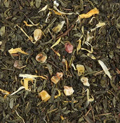 Thés verts, fruit de la passion & ananas parsemés de morceaux de papaye et de calendula.